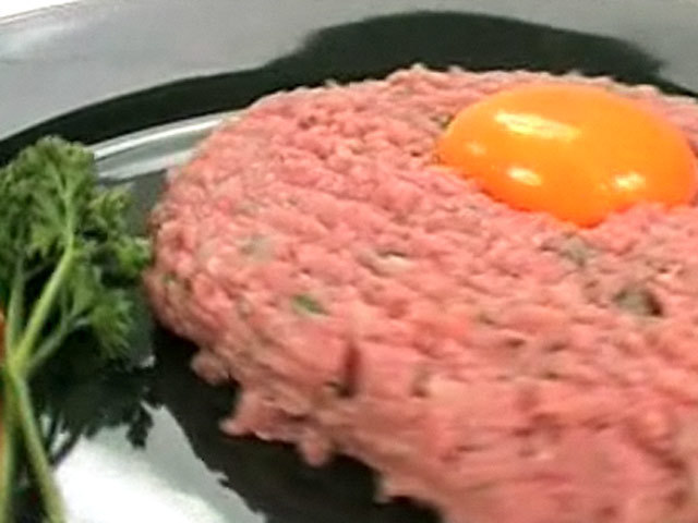 Рецепт приготовления мяса по-татарски.Состав:говядина — 400 гр;лук — 1 штука;яйцо — 1 штука;бульон, перец, соль, масло, каперсы, петрушка.